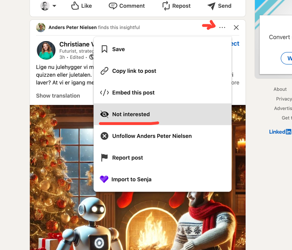 På den måde giver LinkedIn besked om, at det ikke er relevant for dig, og så vil algoritmen forsøge at give dig noget bedre.