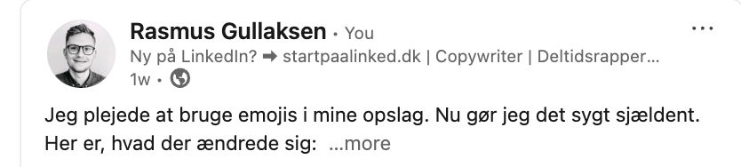 Og med hooks, mener jeg "overskriften" på dit opslag – hvilket helt konkret svarer til de første 2-3 linjer af dit LinkedIn-opslag, alle kan læse uden at trykke "more/læs mere".